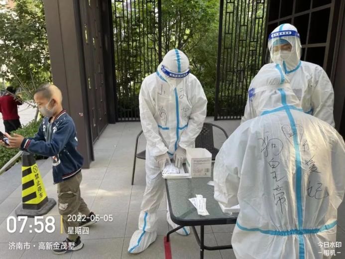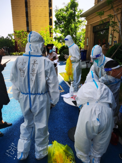 由于一直在高溫下“全副武裝”,志愿者的防護(hù)服早已被汗水浸濕,手掌被泡得發(fā)白,臉上也被口罩勒出了痕跡,更有志愿者出現(xiàn)了頭暈、流鼻血等中暑癥狀。盡管如此,他們也是稍加休整,便再次沖鋒向前。休息時(shí)間,志愿者們席地而坐,匆匆吃完奔赴崗位,因忙碌而錯(cuò)過飯點(diǎn)更是常事,然而他們卻從未有過怨言;腰肌勞損、椎間盤不好的團(tuán)隊(duì)干部即使腰疼的直不起來,也依舊抵擋不住他助力抗疫的熱情與行動(dòng)?!▲喼驹刚邔敶ㄔ趨f(xié)助核酸檢測(cè)時(shí),有一個(gè)小男孩很不配合,由于當(dāng)天的核酸檢測(cè)并沒有貼紙,男孩媽媽便偷偷準(zhǔn)備了小貼畫,拜托尋魯川給小朋友貼上。尋魯川很感動(dòng),并且樂意幫忙,尋魯川說:“他兩只大眼睛直勾勾的盯著貼紙看,特別萌,心都被萌化了,真是開心了一整天,所有的疲憊都一掃而空。” …… 在抗“疫”前線,小鴨人和社區(qū)居民們互相理解,互相配合,如此令人感動(dòng)又暖心的事跡不勝枚舉。